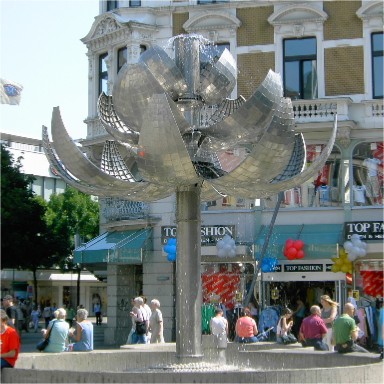 Die an einer Säule angebrachte Kugel öffnet ihre einzelnen Bauteile, so dass schließlich der Eindruck einer geöffneten Rose entsteht.
